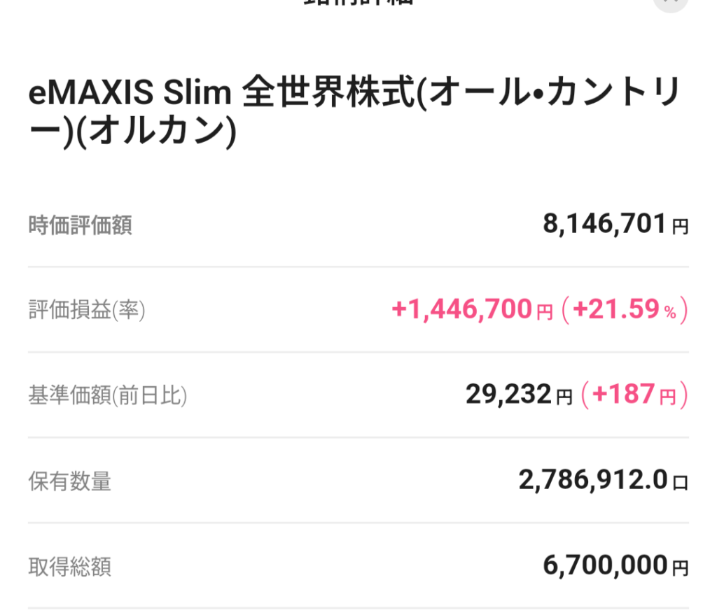 オルカン投資最近の成績 更新日:2025年8月17日 のんびり投資新NISA オルカン投資の最近の成績は、トランプ政権の政策に翻弄されて、マイナスになると思っていたら、プラスで推移してます。 まあ、まだまだ経済はアップダウンあると思うので、引き続き淡々と長期投資を継続しようと思います。 スポンサーリンク 関連記事 NISA積立投資17回目購入終わりました8月末資産運用結果(セゾン・バンガード・グローバルバランスファンド)ドルコスト平均法は必ず儲かる方法ではありません。円がドルに対して安くなってる!海外から資産戻すチャンスか?いまは投資信託が安く買える時期新NISAに向けネット証券口座開設して現金ゲットする方法 投稿ナビゲーション オルカン投資に対する反対意見について