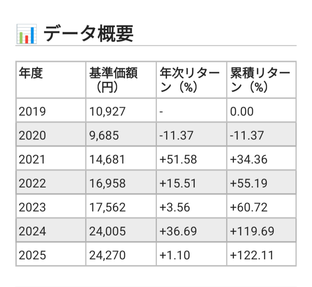 2022年と2023年は、やや落ち着いた成長を見せています。2022年には+15.51%、2023年には+3.56%と、リターンは縮小しましたが、依然としてプラスを維持しています。